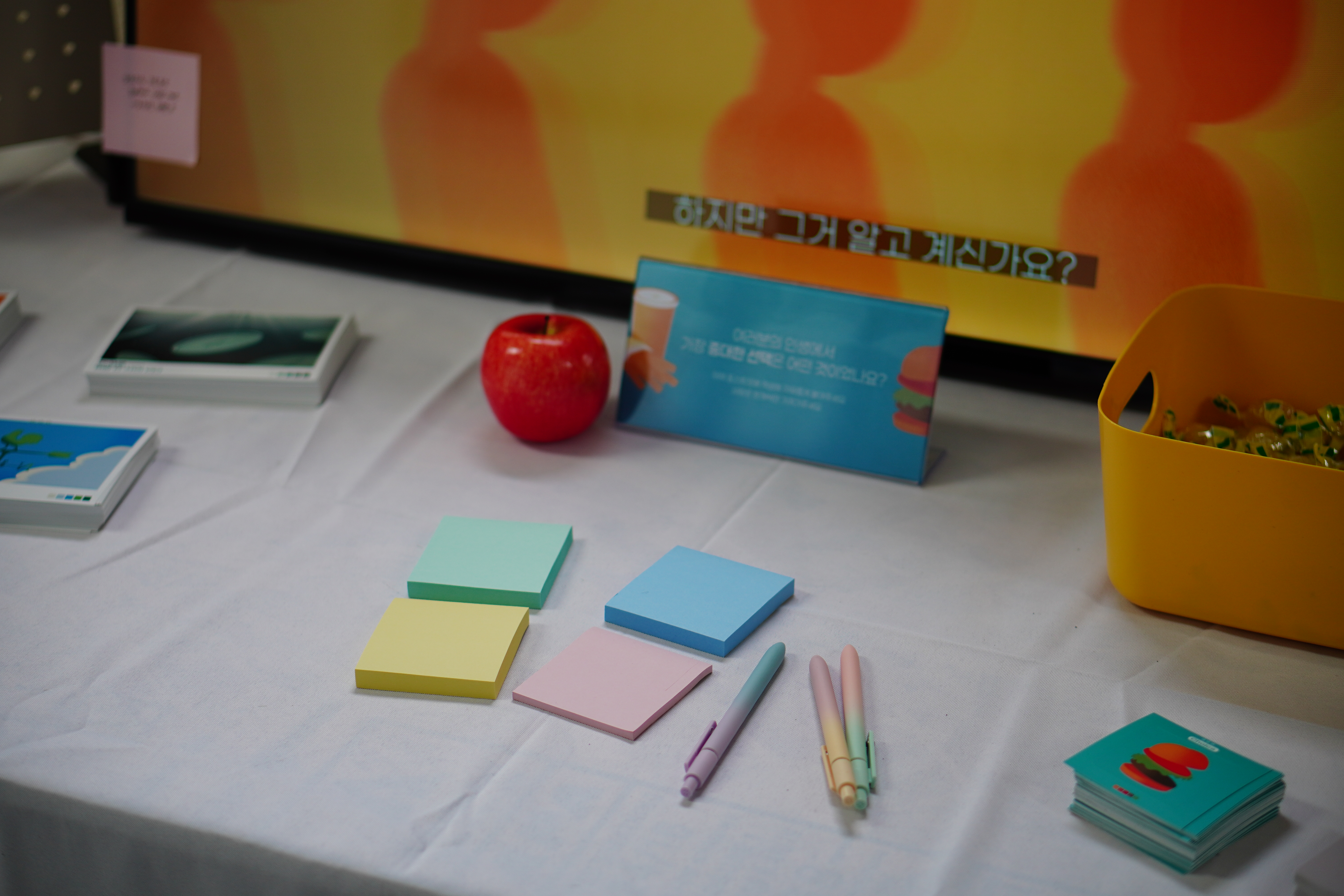 미리 붙어져 있는 포스트잇을 보니, "24살에 대학교 입학한 것", "영상과를 3년 동안 준비하다 대학교 2학년 때 게임전공을 선택한 것" 등등 이 질문을 통해 자신의 삶을 돌아볼 수 있는 그런 부스였던 것 같습니다.